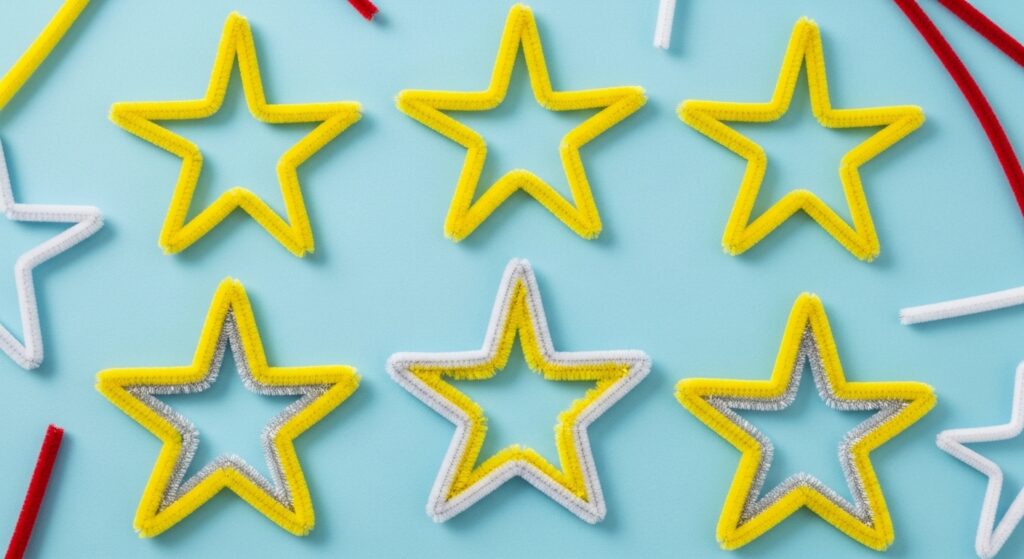 Form stars by bending pipe cleaners into five pointed shapes, crossing and securing at intersections. Use metallic gold and silver for special occasions or bright colors for everyday crafts. This geometry-focused project teaches shape formation, symmetry, and spatial reasoning while creating versatile decorations for various holidays.