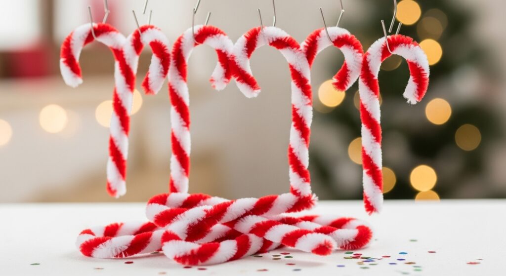 Twist red and white pipe cleaners together, then bend into classic candy cane hooks. Create ornaments, package decorations, or classroom displays. This traditional holiday craft teaches twisting techniques, color patterns, and holiday traditions while producing classic decorations that families recognize and appreciate as handmade contributions to seasonal decorating.