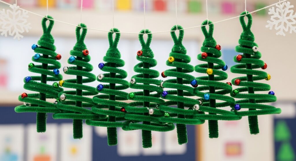 Create miniature Christmas trees by spiraling green pipe cleaners around pencils, then decorating with beaded “ornaments.” Make stars, angels, or other ornament shapes. This holiday craft creates personalized tree decorations children proudly hang at home, teaching that handmade ornaments hold special meaning and become treasured family traditions across years.