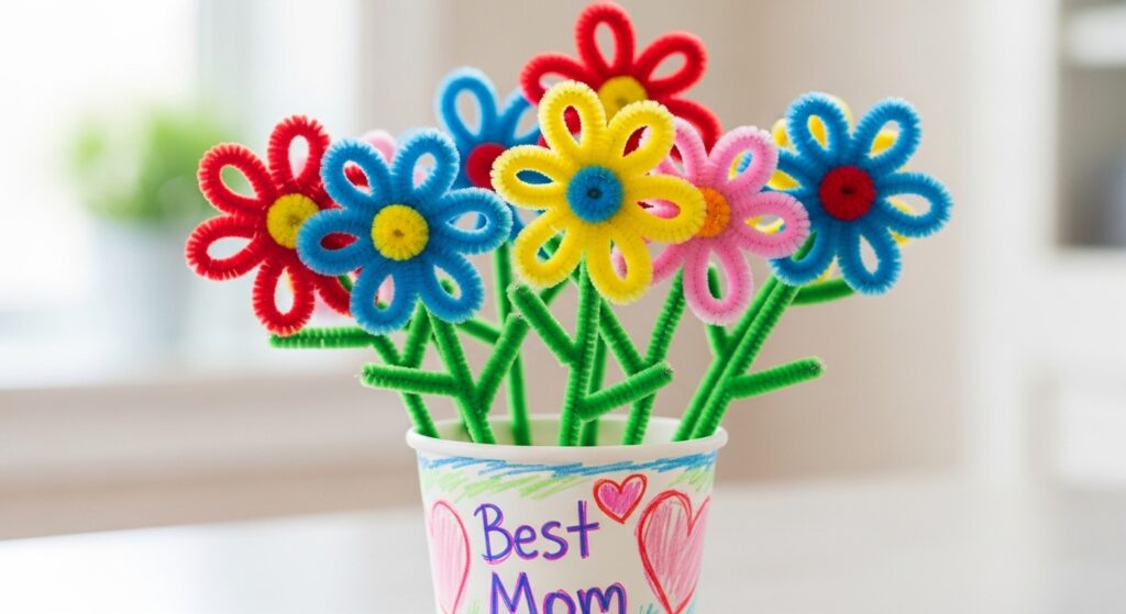 Form flower petals by creating loops at one pipe cleaner end, securing with twists. Wrap green pipe cleaners around pencils to create coiled stems, then attach flowers. This classic project teaches basic shaping while creating gifts for Mother’s Day, teacher appreciation, or spring decorating that parents genuinely treasure.