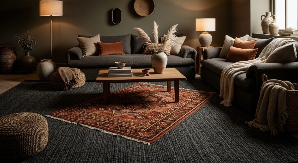 Layering rugs in dark earthy tones creates dimensional warmth and designer-level sophistication underfoot. Start with a large charcoal or dark brown jute rug that anchors your entire seating area. Layer a smaller vintage rug in rust, terracotta, and warm brown tones on top for pattern and color. The combination creates visual depth while adding essential softness and warmth. The layered approach allows you to incorporate pattern without overwhelming the space entirely.