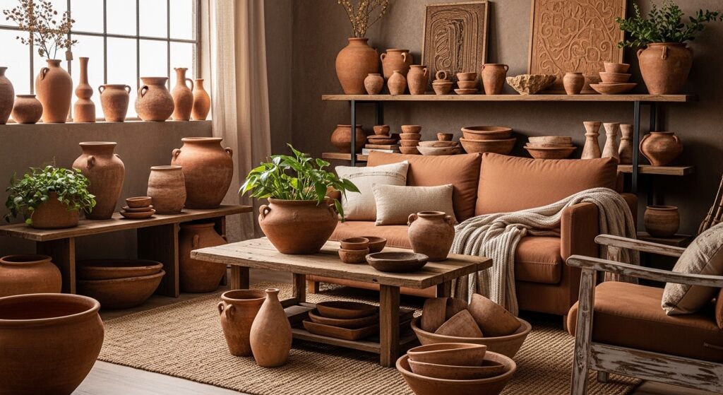 Terracotta and clay accessories bring earth’s most fundamental materials into your living room with warm, organic color. Display handmade terracotta vases in various sizes holding dried flowers or branches throughout your space. Use clay planters in natural rust tones for your indoor plants, connecting them to earth literally. Add earthenware bowls for holding collected stones, jewelry, or simply as sculptural objects. The warm rust and brown tones add essential color while maintaining the earthy, natural aesthetic.