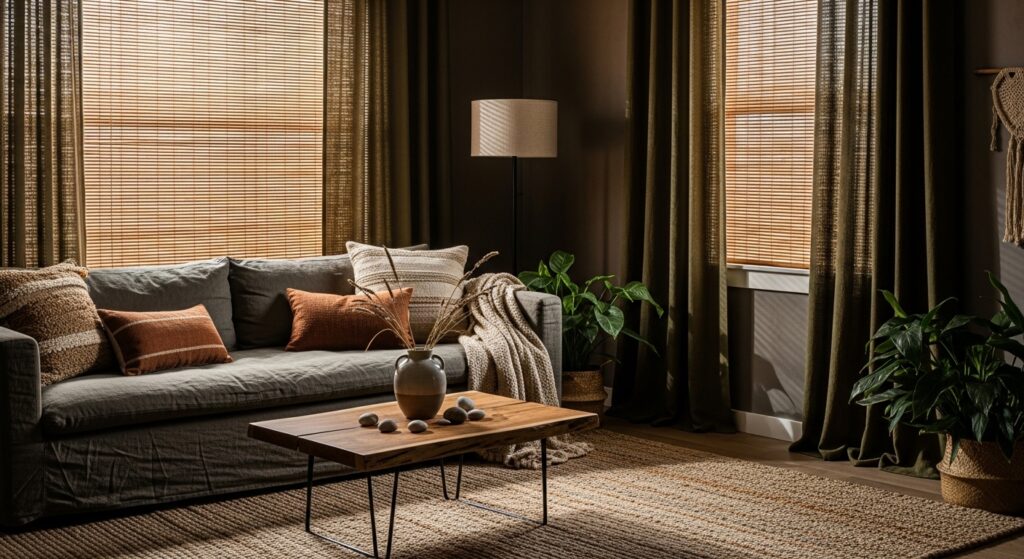 Natural fiber window treatments maintain the organic aesthetic while providing essential light control and privacy. Install bamboo or woven wood blinds that filter light naturally while adding horizontal texture. Layer heavy linen or hemp curtains in deep olive, warm brown, or charcoal for complete light control. The natural materials add earthy texture and organic warmth rather than synthetic fabrics. The varied layers provide flexibility—sheer natural light or complete darkness as needed.