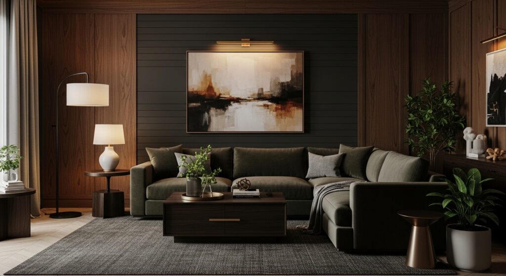 Dark wood paneling adds substantial architectural character and organic warmth essential to dark earthy living rooms. Install walnut or mahogany paneling in board-and-batten or traditional raised-panel styles for classic elegance. Alternatively, use charcoal or ebony-stained shiplap for modern farmhouse appeal with earthy character. The wood adds three-dimensional texture and shadow play that flat painted walls cannot achieve. The natural grain patterns create organic interest throughout the space.
