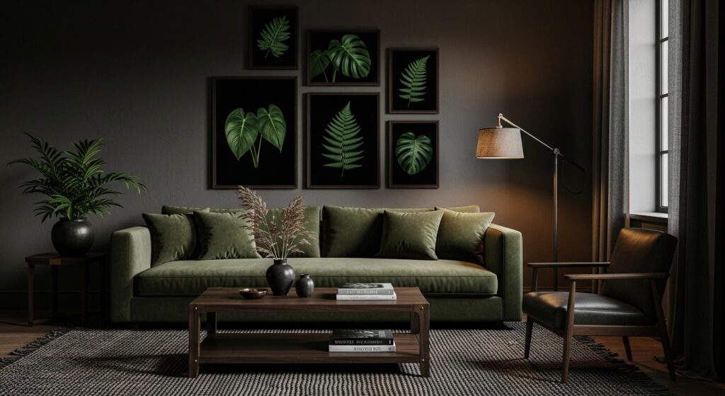 Botanical artwork maintains the nature connection while respecting the dark, moody aesthetic you’re creating. Choose prints featuring deep green tropical leaves, ferns, or dramatic flowers against black or charcoal backgrounds. Dark botanical photography with heavy shadows creates mystery and drama rather than bright garden cheerfulness. Frame prints in dark wood or matte black for cohesive gallery walls. The natural subject matter softens the space without introducing conflicting bright colors.