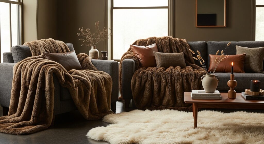 Sheepskin and fur textures add incredible tactile luxury and organic comfort to dark earthy spaces. Place a natural sheepskin rug beside your sofa or in front of the fireplace for plush softness underfoot. Drape faux fur throws in chocolate brown, camel, or charcoal across seating for warmth and visual texture. Add fur or sheepskin pillows that invite touching and create sensory richness. The natural animal fibers connect your space to traditional, rustic living while adding modern luxury.