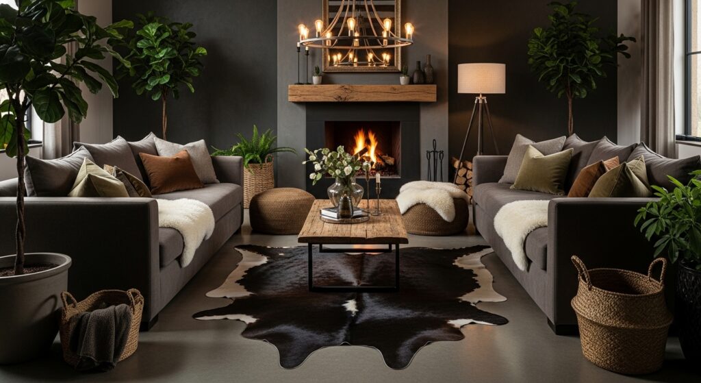 A cowhide or natural hide rug adds organic pattern and rustic luxury to dark earthy living rooms. Choose a dark brown and cream cowhide with natural variations and patterns that make each hide unique. The organic shape and natural pattern add visual interest without geometric rigidity or manufactured designs. Layer it over larger rugs or use it alone to define seating areas with natural beauty. The soft, supple leather adds tactile richness underfoot.