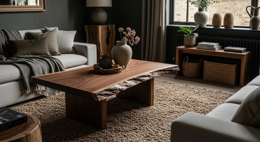 Live edge wood furniture celebrates trees in their most authentic form with extraordinary natural beauty. Choose a dark walnut or mahogany live edge coffee table that preserves the bark edge and natural contours. The organic, flowing lines contrast beautifully with straight architectural elements and geometric furniture throughout. Each live edge piece is completely unique with grain patterns, knots, and variations that make it one-of-a-kind. This furniture style brings raw natural beauty directly into your dark earthy sanctuary.
