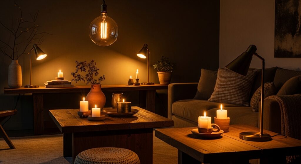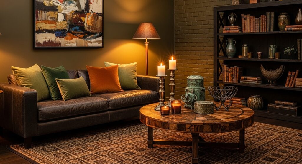 Candlelight is perhaps the most natural form of ambient lighting, connecting to millennia of human experience around fire. The warm golden glow enhances earth tones beautifully and creates intimate, romantic atmosphere. Natural candle materials like beeswax add subtle honey scent and burn cleaner than synthetic alternatives. The ritual of lighting candles signals transition from daytime to cozy evening mode in your sanctuary. This abundant warm candlelight creates that essential dreamy quality that makes dark earthy living rooms feel truly magical and special.