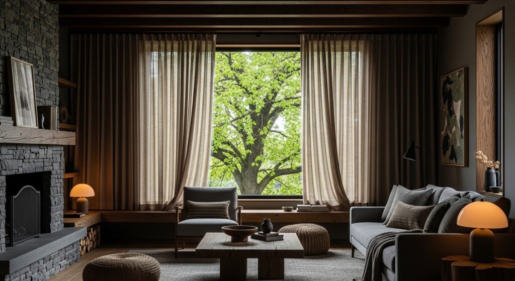 These natural window treatments also provide insulation, making your space more comfortable and energy-efficient year-round. The organic materials breathe naturally and age beautifully, developing character over time. The earth-tone colors coordinate perfectly with your dark earthy palette while framing windows beautifully. Heavy natural curtains also improve acoustics, absorbing sound and making rooms feel quieter and more intimate. This thoughtful window dressing completes the natural, earth-connected aesthetic from every angle while providing genuine functional benefits.