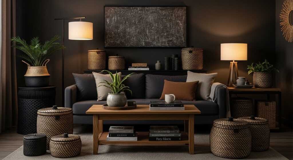 Woven natural baskets provide functional storage while adding essential three-dimensional organic texture to dark earthy spaces. Use large seagrass or dark-stained rattan baskets to store blankets, magazines, or firewood near your fireplace. Add medium baskets on shelves for organizing smaller items while displaying beautiful handwoven craftsmanship. The varied weave patterns and natural fibers add textural interest that flat surfaces cannot provide.