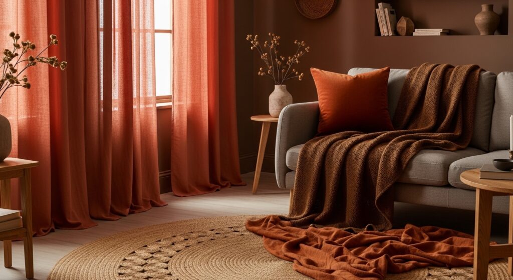 Layering textiles in various earth tones and textures creates visual richness and tactile comfort throughout dark earthy spaces. Hang terracotta or rust-colored linen curtains that filter light with warm, organic color. Add velvet throw pillows in deep rust, warm brown, and forest green for luxurious softness. Drape a chunky chocolate brown wool throw across your sofa for warmth and texture. Layer a large jute or sisal rug as a neutral foundation that adds organic texture underfoot.