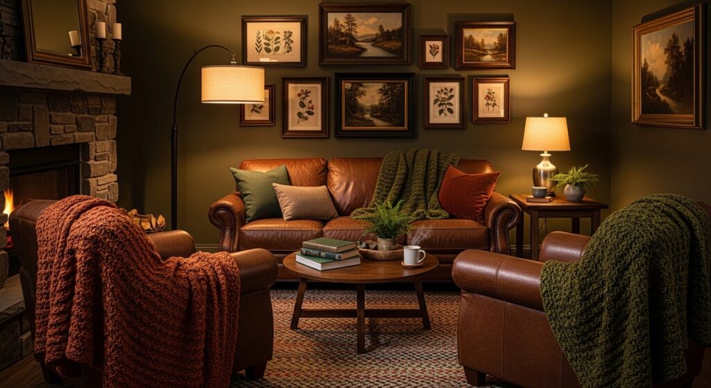 These plush textures balance harder surfaces like wood, stone, and leather beautifully throughout your room. Natural sheepskin regulates temperature wonderfully, staying cool in summer and warm in winter remarkably. The soft, cloud-like texture creates that essential cozy factor that makes dark earthy rooms genuinely inviting. Modern high-quality faux alternatives provide cruelty-free luxury that’s often easier to maintain. These luxurious natural textures prove that dark earthy living rooms can be supremely comfortable and indulgently soft.