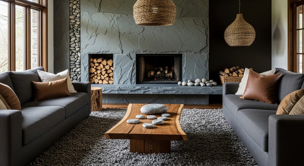 Natural stone brings earth’s most ancient materials directly into your living room with substantial beauty. Install a slate or dark stone fireplace surround that creates a dramatic focal point with geological texture. Display river rocks and smooth stones in wooden bowls as natural sculpture and meditation objects. Use slate or dark marble coasters and trivets that add functional beauty. The varied stone surfaces create tactile interest and connect your space to earth’s permanent, enduring materials.