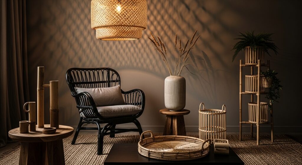 Woven rattan and bamboo elements add essential three-dimensional organic texture to dark earthy spaces. Choose a rattan chair in dark stain or natural honey tones that adds sculptural seating. Hang a woven rattan or bamboo pendant light that casts beautiful organic shadows when illuminated. Add bamboo blinds or decorative accessories throughout the space. The natural woven materials create visual and tactile texture that flat surfaces cannot provide.