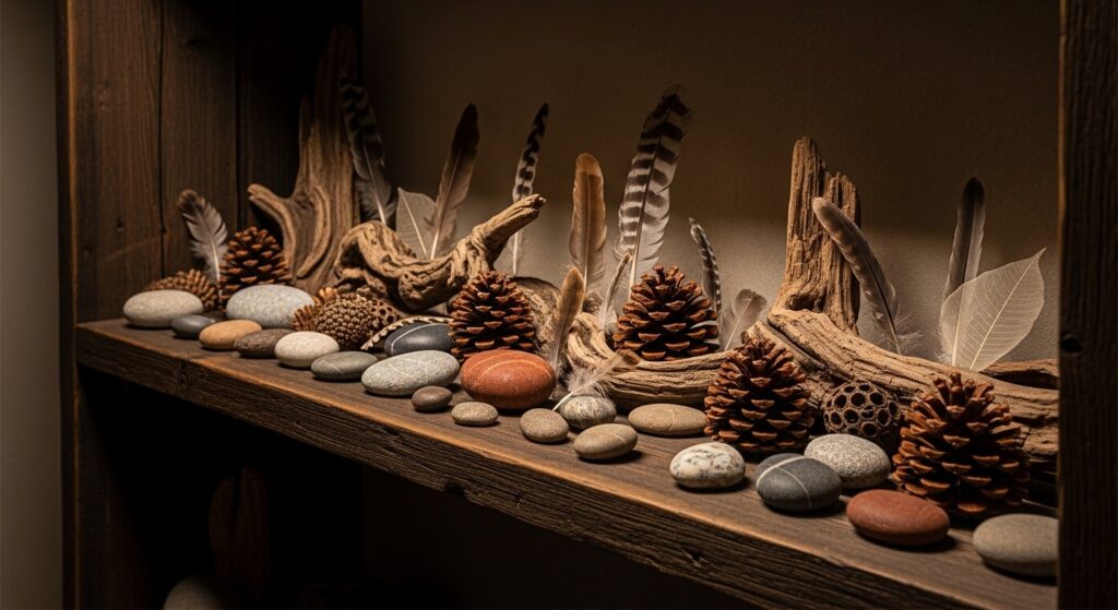 Collected natural objects create meaningful displays that celebrate nature’s artistry and your personal experiences. Arrange smooth river stones in a dark wooden bowl as natural sculpture. Display interesting driftwood pieces with beautiful weathered shapes and silvery patina. Add pinecones, seed pods, or interesting bark in glass jars or on shelves. Include found feathers or shells from meaningful places. These treasures cost nothing but carry memories and demonstrate deep appreciation for nature.
