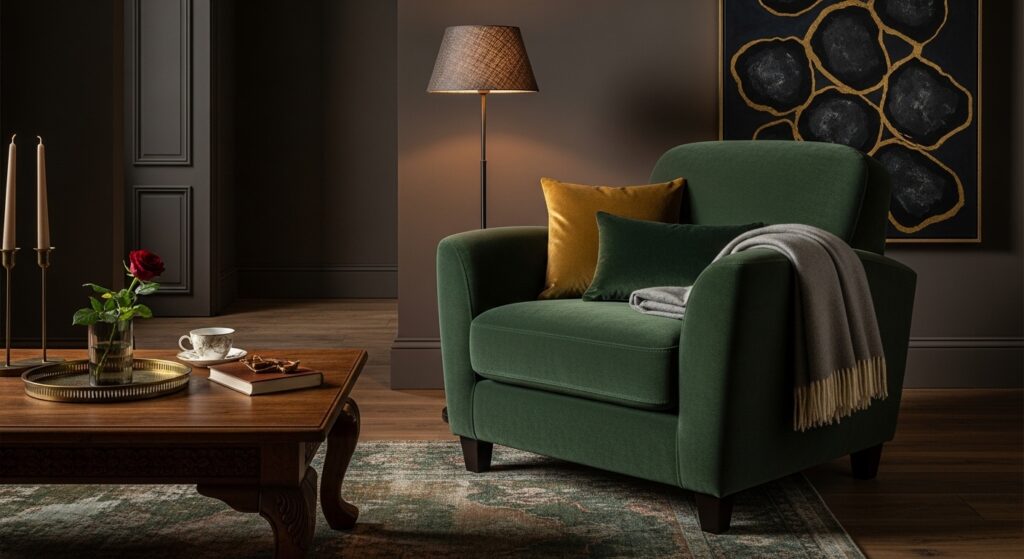 Dark velvet seating adds incredible depth, luxury, and sophisticated comfort to earthy living rooms. Choose an armchair or ottoman in deep brown, forest green, or charcoal velvet that catches light beautifully. The rich fabric creates jewel-like depth and visual interest within your earth-tone palette. Velvet’s distinctive nap creates shadows and highlights that change with viewing angle and lighting throughout the day. The plush texture invites touching and sinking into comfort.