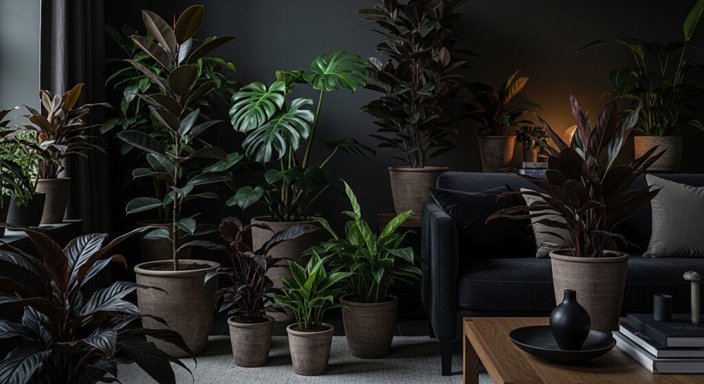 Plants in darker varieties maintain the moody aesthetic while adding essential living elements and fresh oxygen. Choose plants with deep green or burgundy foliage—monstera, rubber trees, philodendrons—that complement rather than contrast with dark walls. Add a black ZZ plant or snake plant with dark edges for dramatic sculptural presence. Display them in terracotta, dark ceramic, or natural clay planters that coordinate with your earthy palette. The living greenery adds life without introducing bright, jarring colors.