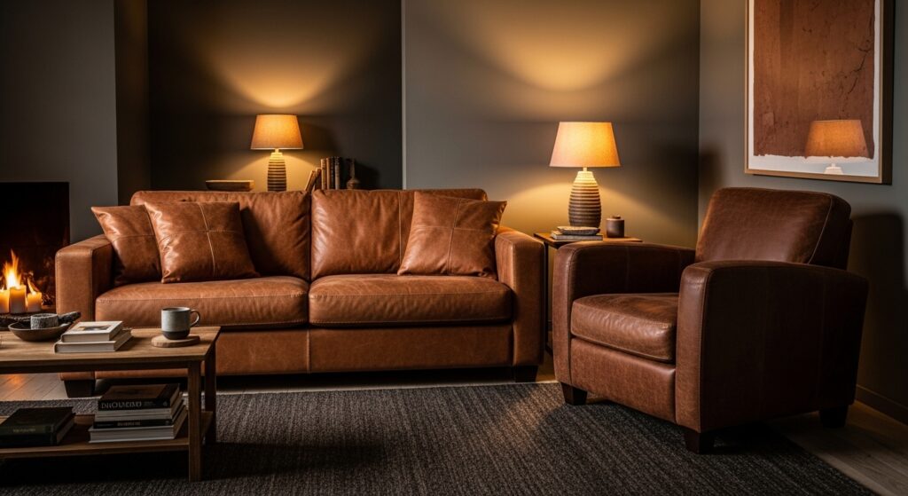 Rich brown leather furniture adds essential warmth, organic texture, and timeless sophistication to dark earthy spaces. Choose a deep cognac or chocolate brown leather sofa that develops beautiful character over time. Add leather armchairs in complementary brown tones that create layered depth within the earth-tone palette. The natural material ages gorgeously, becoming softer and more attractive with years of use and developing a patina that tells your home’s story.