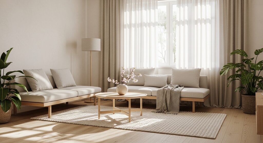 Open curtains during the day to maximize natural light. Sunlight enhances neutral tones and makes your minimalist living room feel fresh and uplifting.