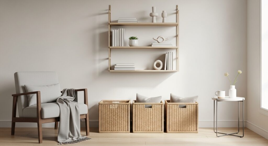 Closed cabinets, storage benches, and baskets keep everyday clutter out of sight. Functional storage is key to maintaining a minimalist living room because it allows you to stay organized without sacrificing clean design.