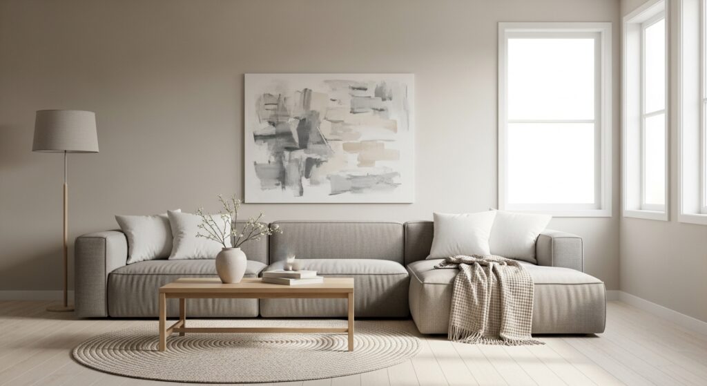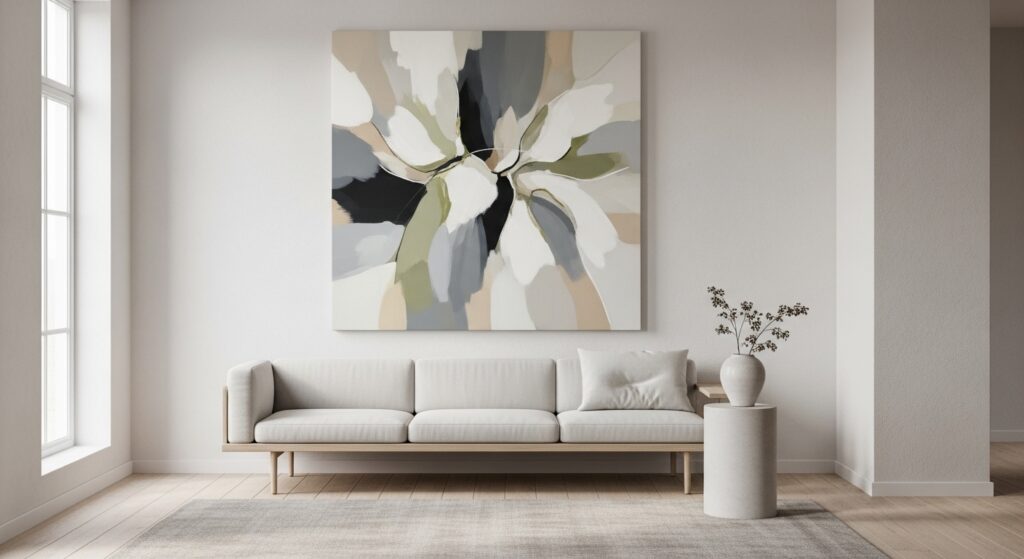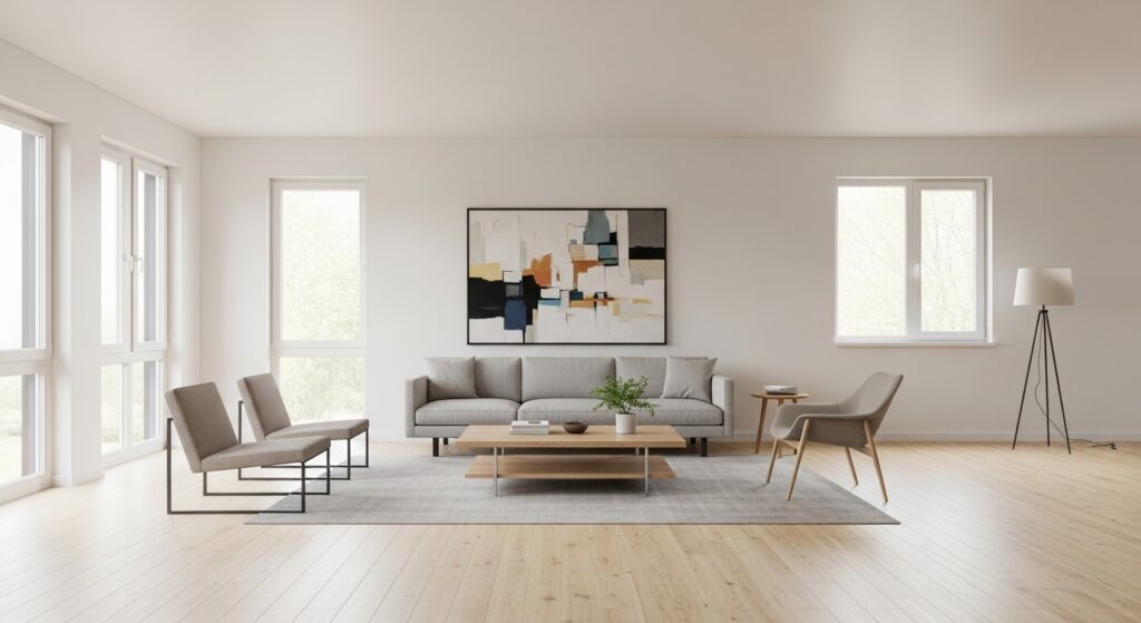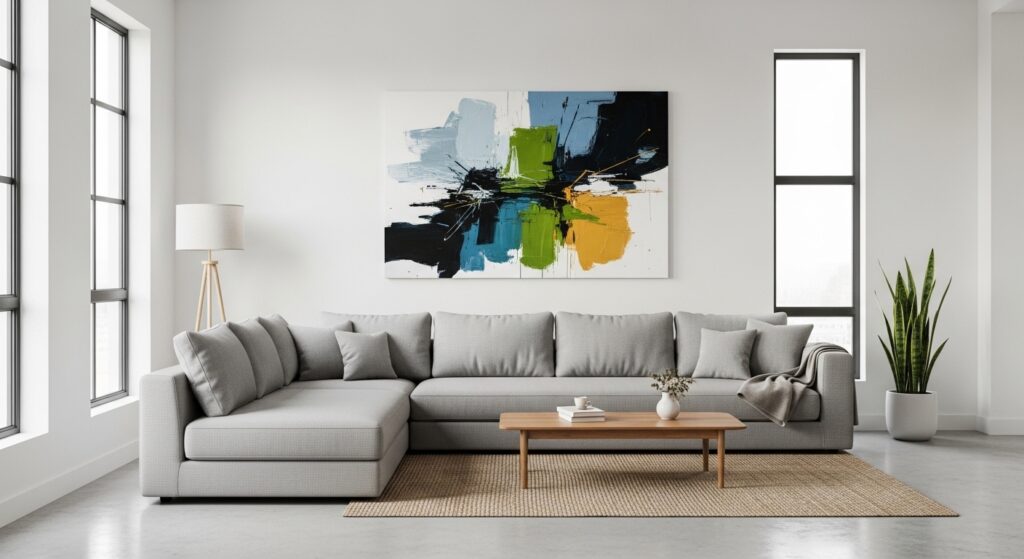 Instead of a busy gallery wall, choose one large statement piece. Oversized artwork creates impact while maintaining simplicity, helping your minimalist living room feel calm and curated.