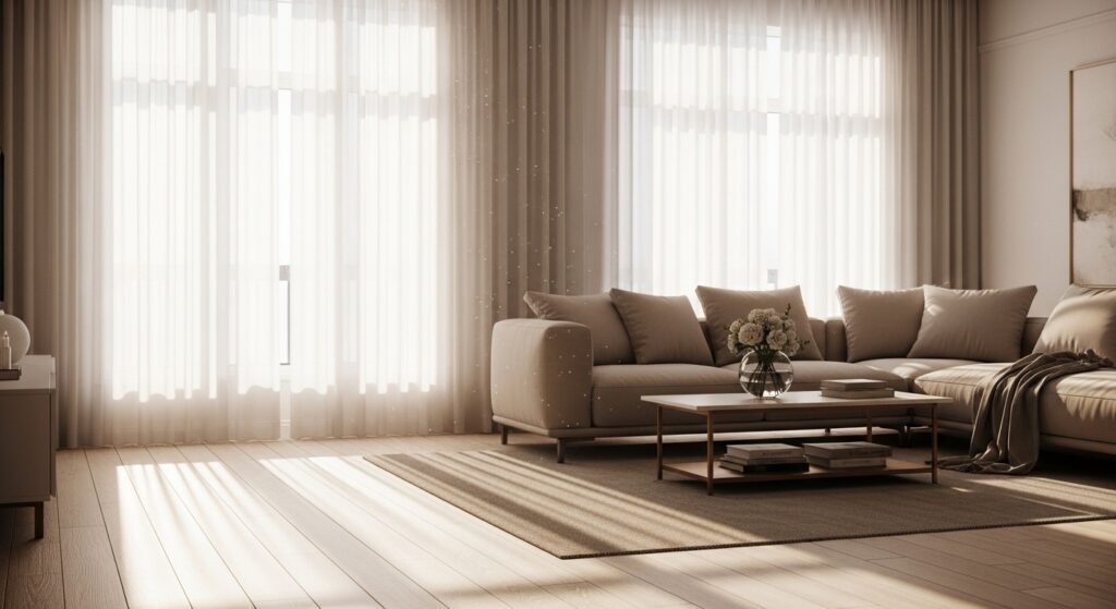 Heavy drapes can feel overwhelming. Opt for light, airy curtains that soften the room without adding visual weight.