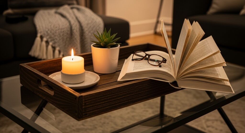 A tray, candle, and book are often enough. Simplicity makes your living room feel balanced and inviting.