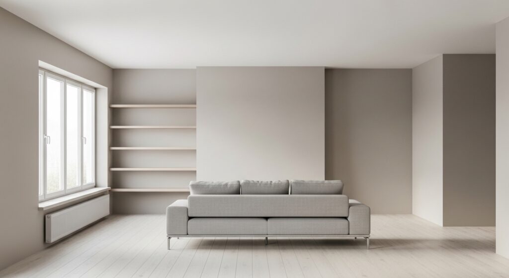 Soft neutrals like warm white, beige, and light gray instantly create a peaceful atmosphere. A neutral color palette reflects light beautifully and makes your minimalist living room feel open, airy, and timeless without overwhelming visual distractions.